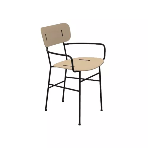 De Piuma PM LG stoel met armleuningen combineert lichtheid, elegantie en veelzijdigheid. Het metalen onderstel met vier poten ondersteunt een gefineerde houten zitting en rugleuning, aangevuld met zichtbare metalen inzetstukken en zwarte knoppen voor een verfijnde look. Zowel het frame als de zitting zijn aanpasbaar en ideaal voor moderne horecagelegenheden en veelzijdige interieurs.