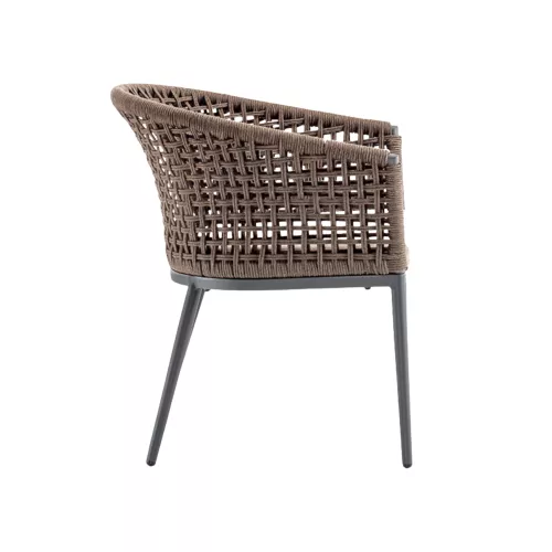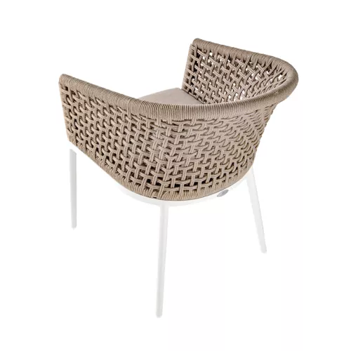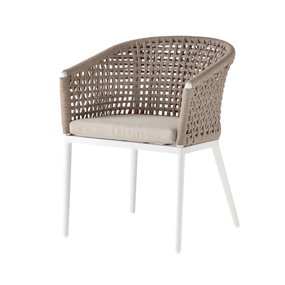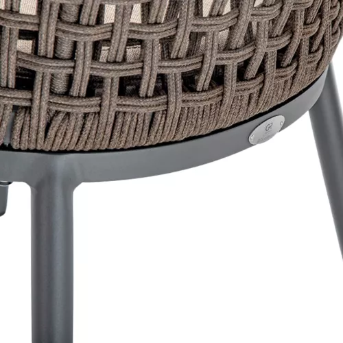 De Santiago stoel is een stijlvolle combinatie van design en comfort. Het aluminium frame is omwonden met polyester touw, volgens de nieuwste trends. De acryl kussenbekleding biedt extra comfort. Geschikt voor zowel binnen- als buitengebruik in horecaomgevingen.